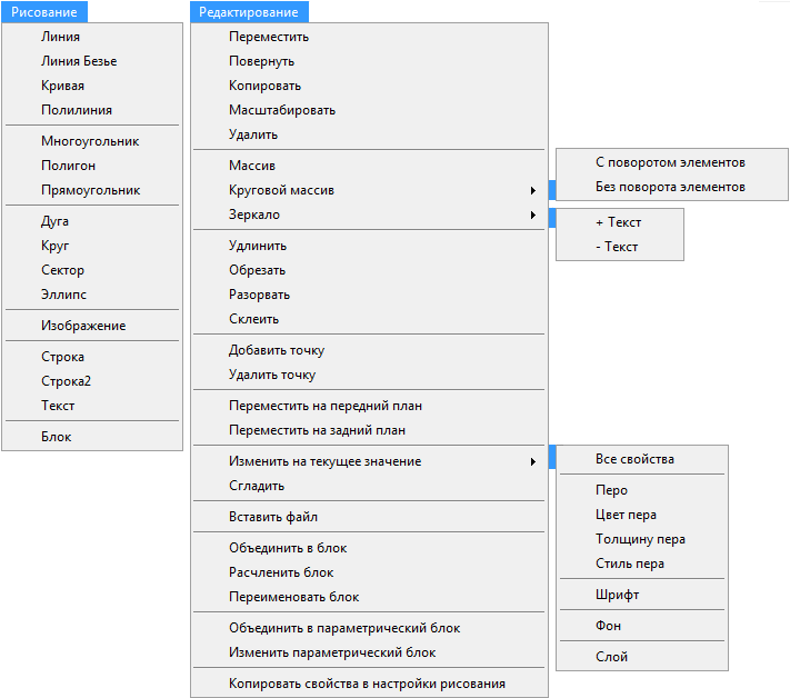 Повтор предыдущей команды вызывается клавишей ENTER или щелчком правой кнопки мыши. Клавиша ESC или щелчок правой кнопки мыши завершают ввод линий, кривых и полигонов (прекращают ввод вершин) и завершают выполнение команд "Удлинить", "Обрезать", "Добавить точку", "Удалить точку".