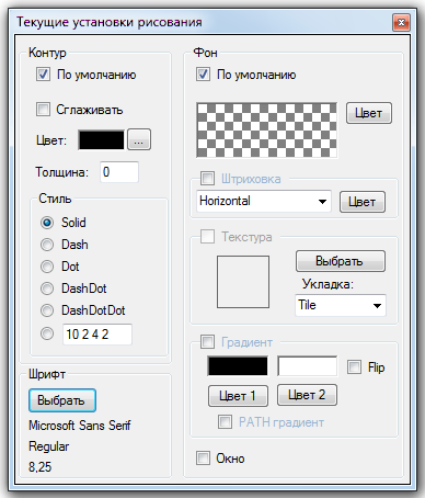 Цвет, стиль, толщина линий, цвет фона, шрифт вводимых графических примитивов определяются текущими установками этих параметров. Диалог "Текущие установки рисования" вызывается клавишей F4 или щелчком по кнопке "Уст."