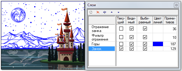 Графические примитивы можно выбирать щелчком по ним левой кнопкой мыши, либо рамкой. Рамка, рисуемая слева направо, выбирает те примитивы, которые полностью охватываются ей. Рамка, рисуемая справа налево, захватывает все примитивы, которые она пересекает. Если в момент выбора держать нажатой клавишу '+' цифрового блока клавиатуры - выбранный примитив добавится к уже существующему набору, нажатая в момент выбора клавиша '-' (минус) - удаляет выбранный примитив из существующего набора. Примитивы, расположенные на невидимых слоях, либо на слоях с неотмеченным свойством "Выбираемый", не могут быть выбраны. Команды редактирования действуют на уже выбранные примитивы, т.е. сначала примитивы нужно выбрать, а потом применить к ним соответствующую команду.
